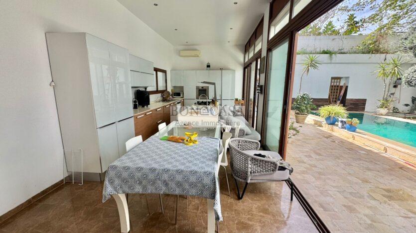 La partie jour se compose d’un grand salon/salle à manger lumineux grâce à l’ouverture de sa baie vitrai qui donne sur et la piscine et le jardin, un séjour avec un coin cheminée et une vaste cuisine en îlot entièrement équipée donnant également sur la piscine.