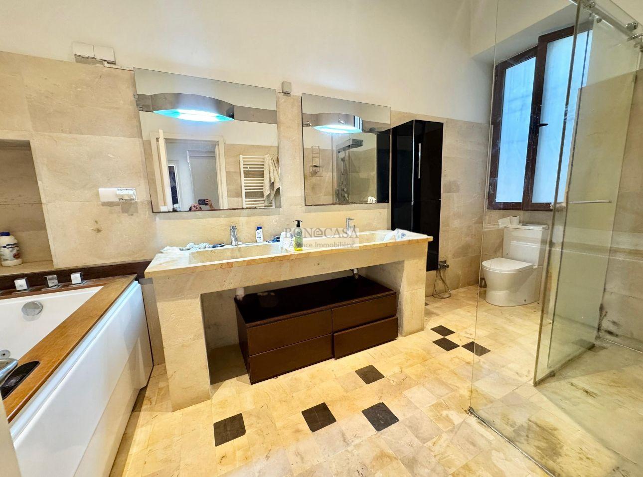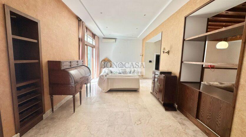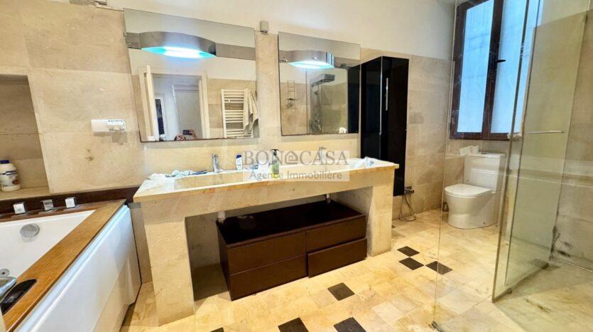 La partie nuit abrite une grande suite parentale avec son dressing et sa salle de bain avec baignoire et douche à l’italienne, deux suites junior avec sa salle d’eau avec une douche à l’italienne et une petite chambre à coucher.