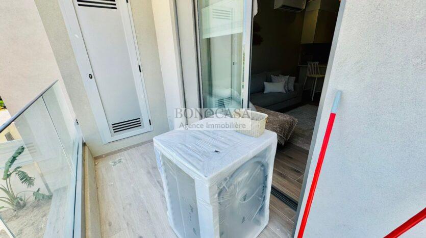 BONACASA vous propose à la location un superbe appartement richement meublé neuf, jamais habité avec un style moderne et raffiné, situé au premier étage d’une résidence récemment construite, calme et sécurisée à 5 minutes de la Marsa et des jardins de Carthage.
