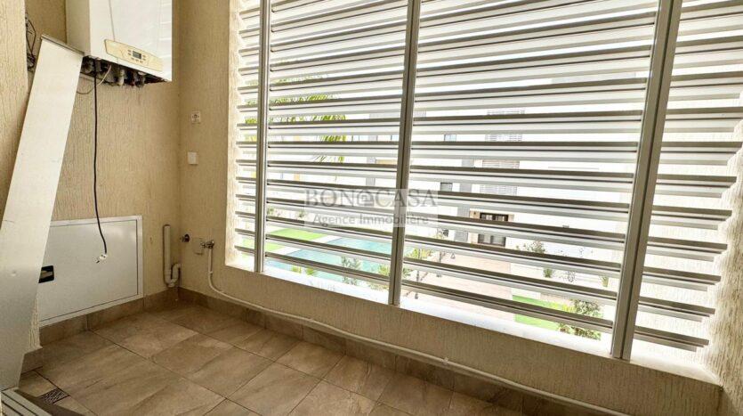 La partie jour se compose d’un salon/salle à manger spacieux et lumineux donnant sur un balcon avec une vue sur la piscine, une cuisine bien équipée donnant sur un séchoir et une salle d’eau invités.