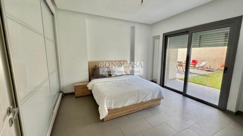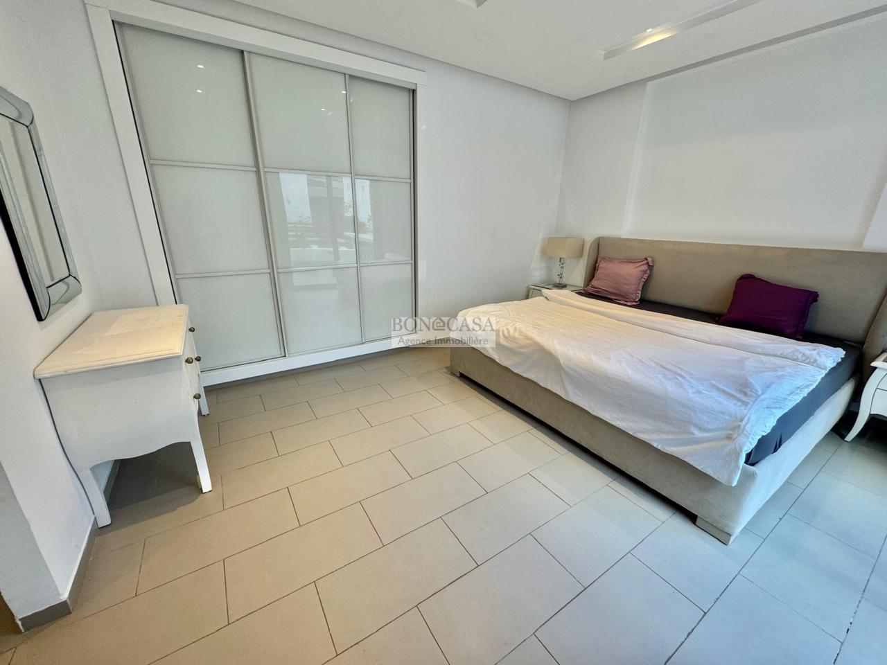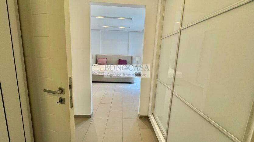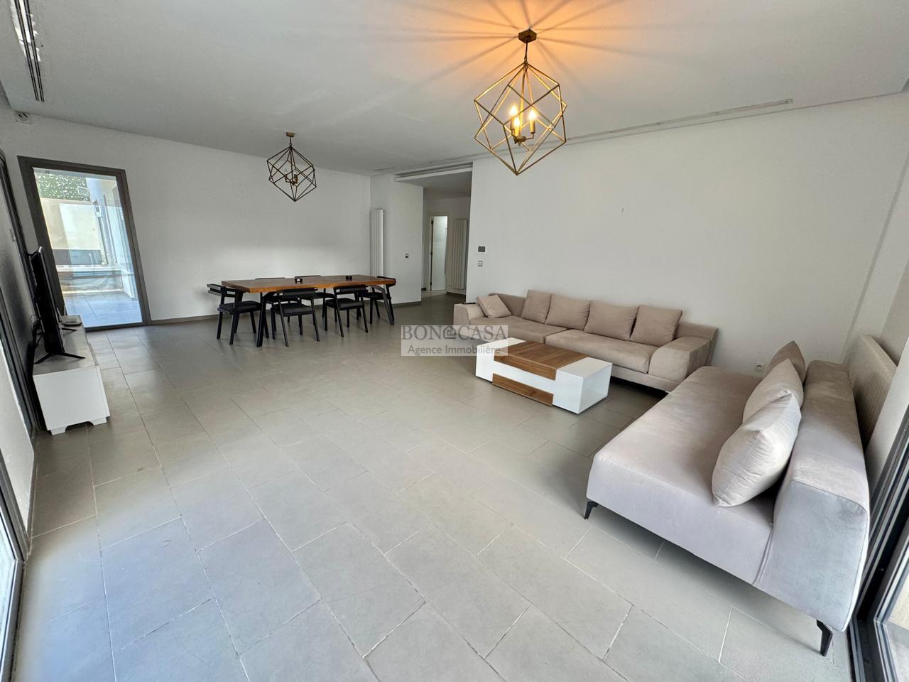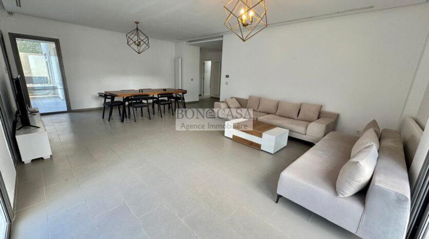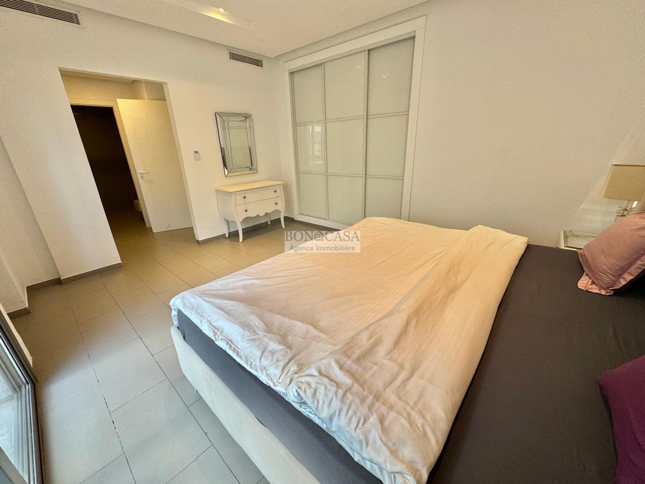 BONACASA vous propose à la location un superbe appartement richement meublé avec un style moderne et raffiné situé au rez-de-chaussée d’une résidence calme et bien sécurisée.