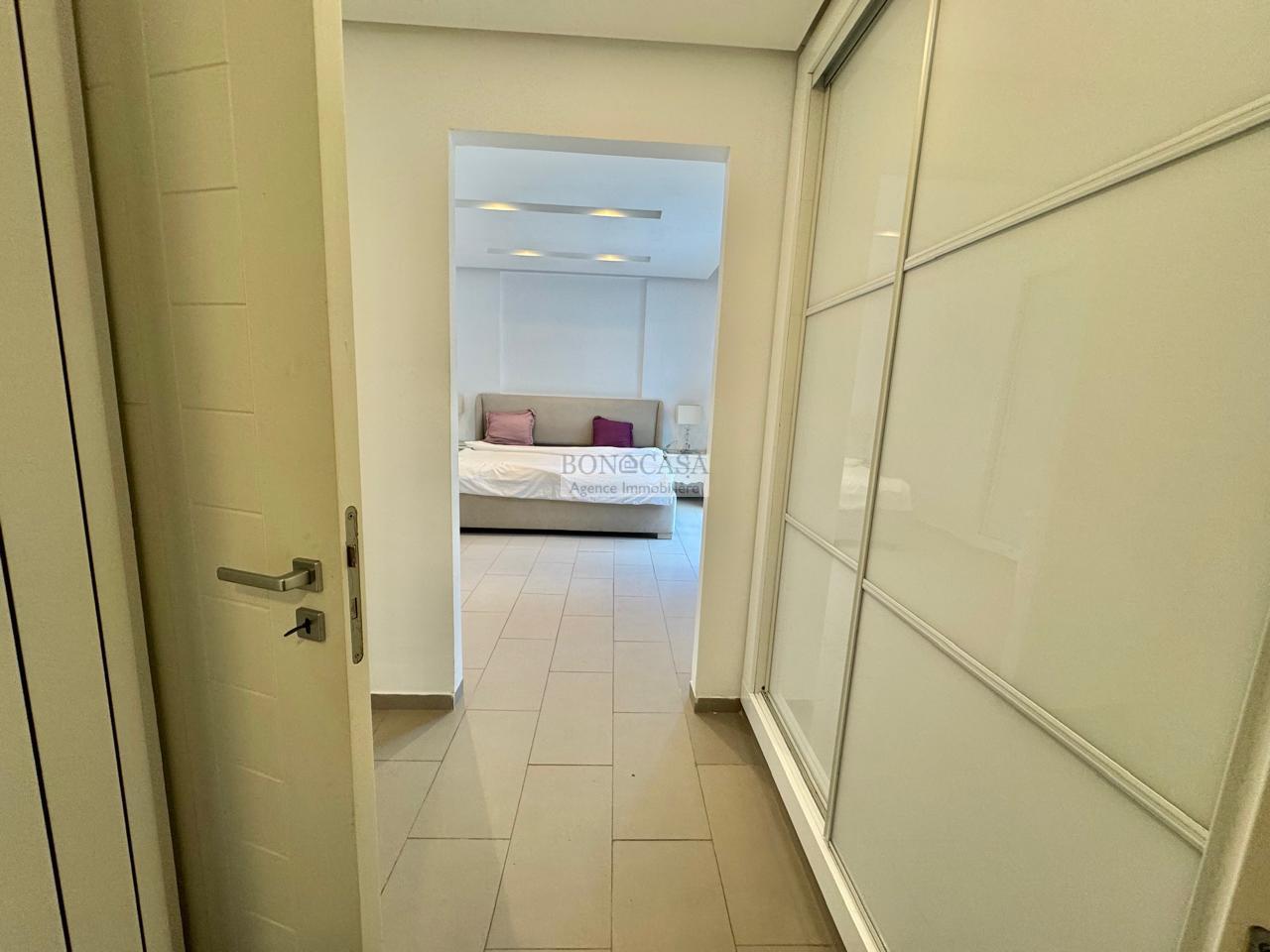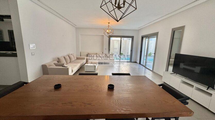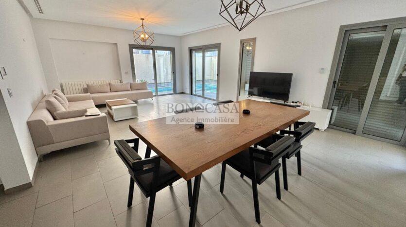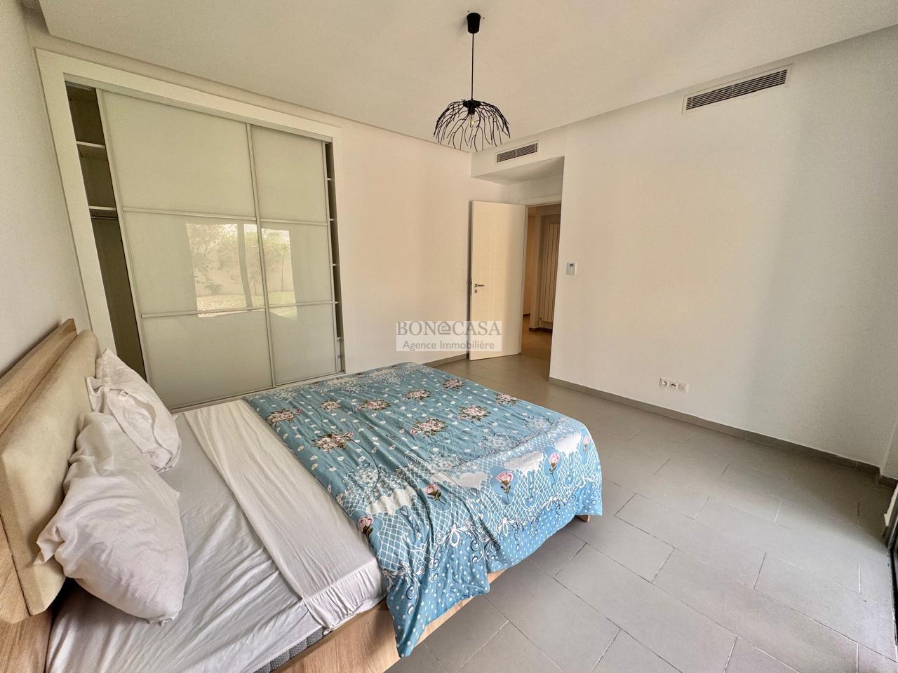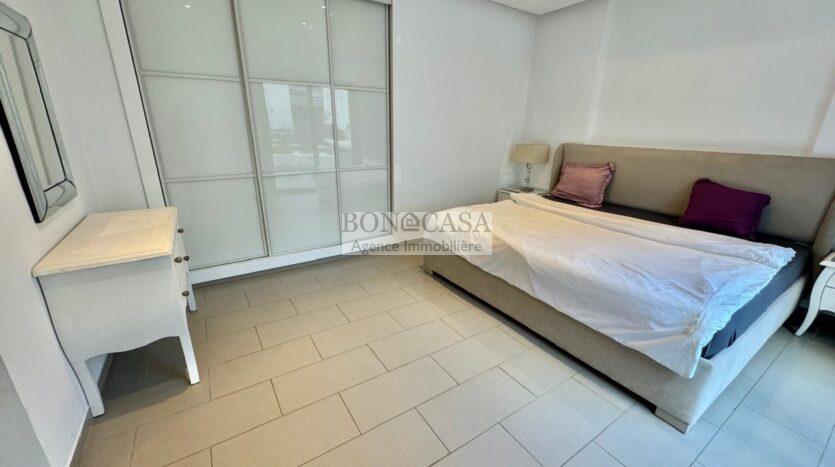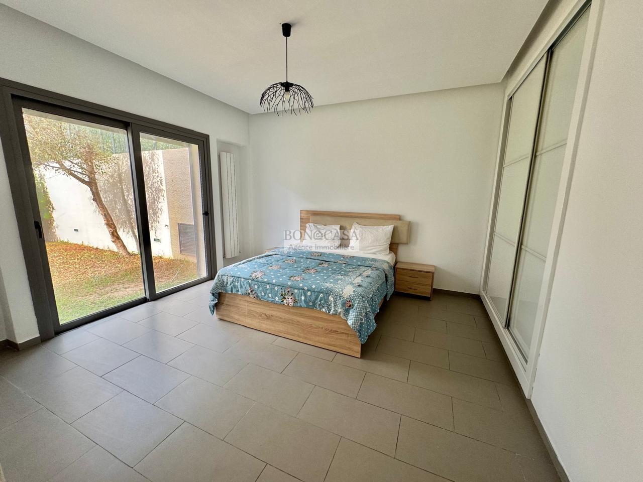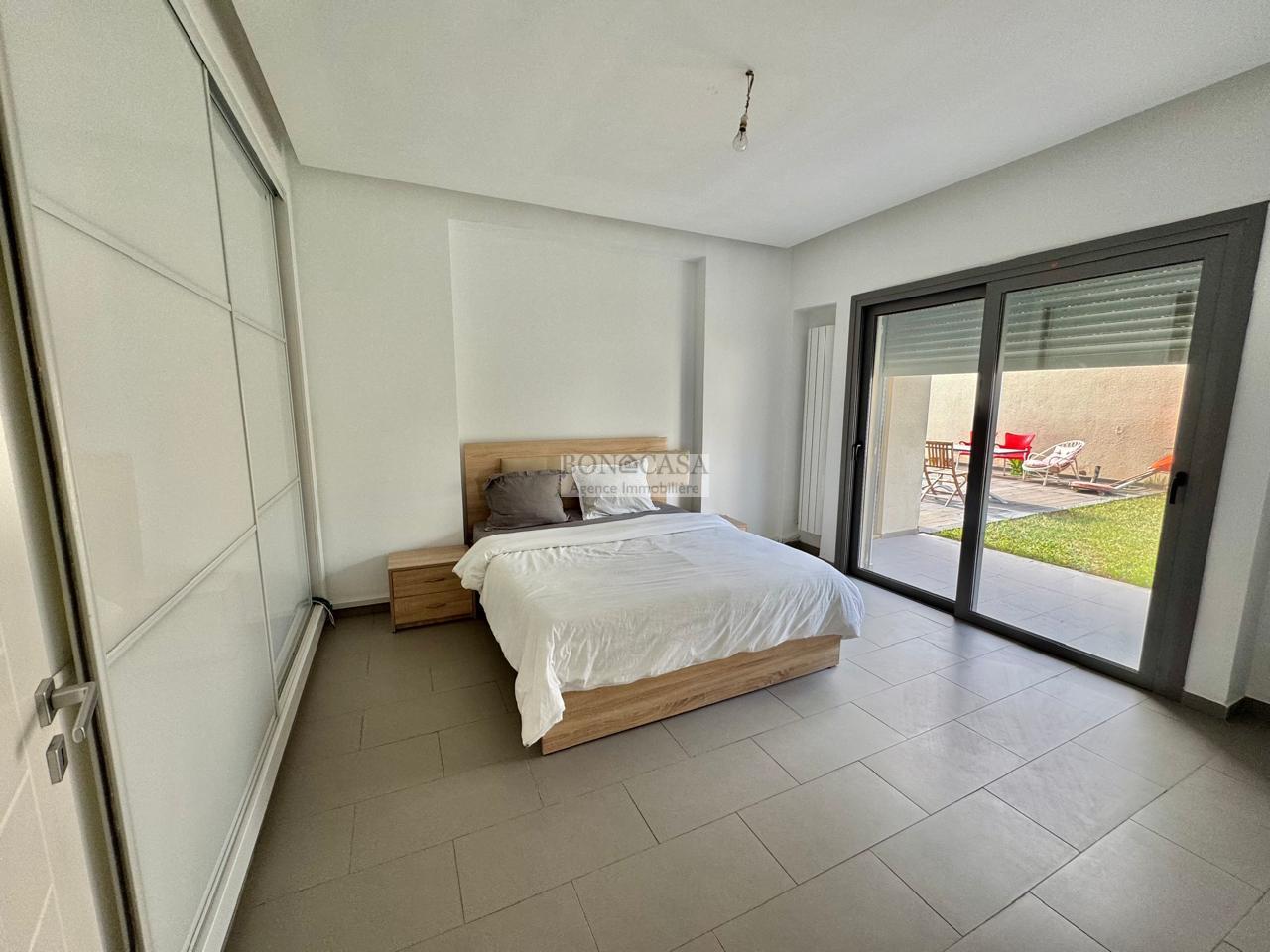 BONACASA vous propose à la location un superbe appartement richement meublé avec un style moderne et raffiné situé au rez-de-chaussée d’une résidence calme et bien sécurisée.