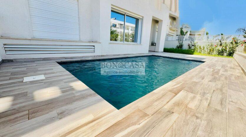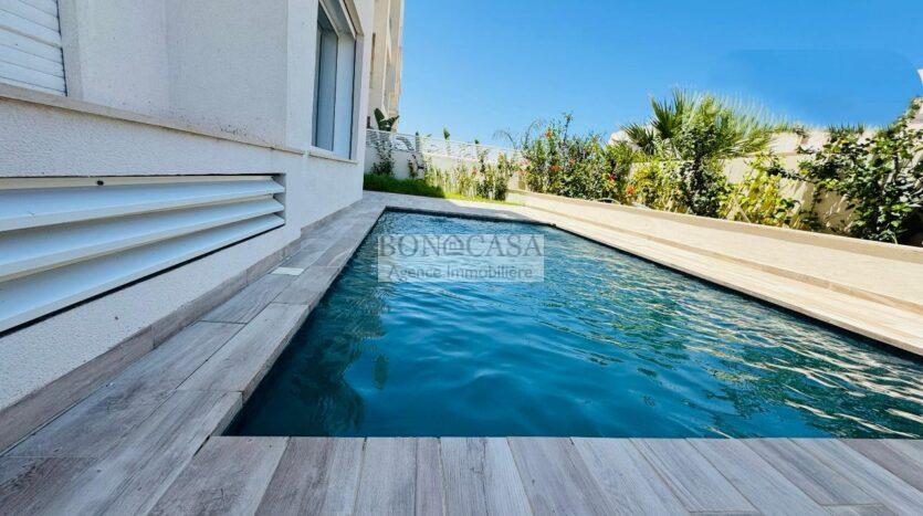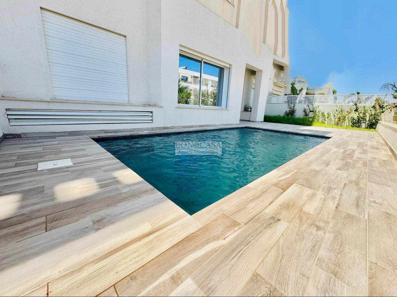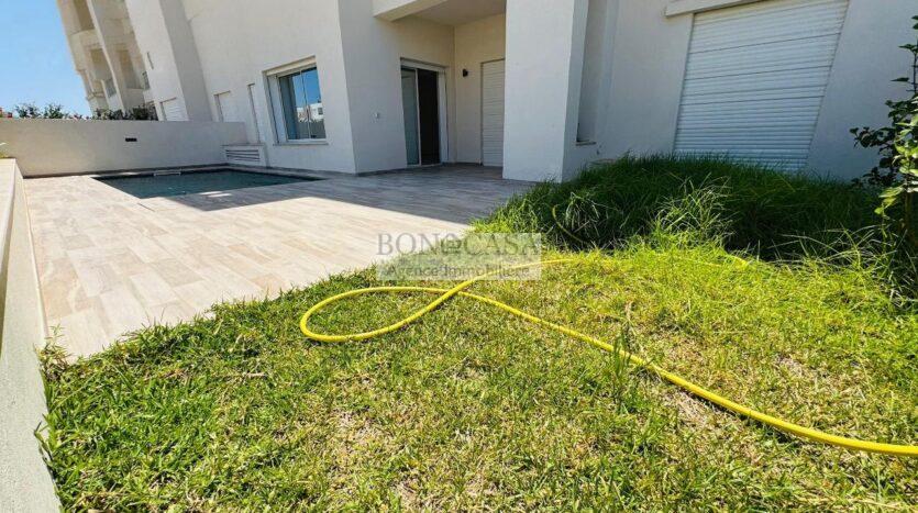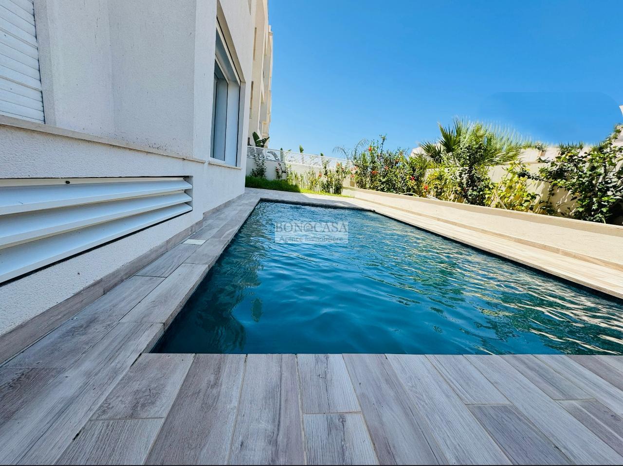 BONACASA vous propose à la location un magnifique appartement neuf avec un jardin et piscine privatifs situé au rez-de-chaussée d’une résidence calme et sécurisée.
