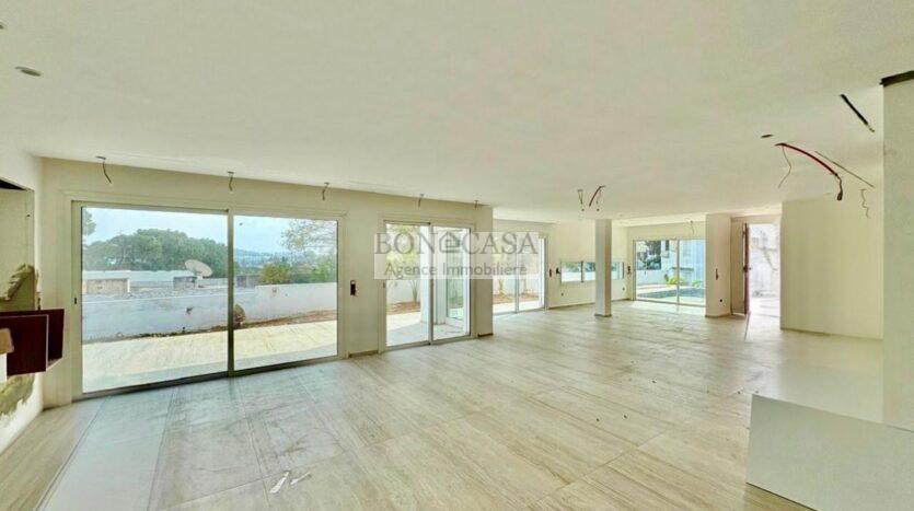 Le rez-de-chaussée se compose un vaste salon/salle à manger donnant sur le jardin et la piscine, une suite, une cuisine américaine bien équipée et une salle d’eau invités.
