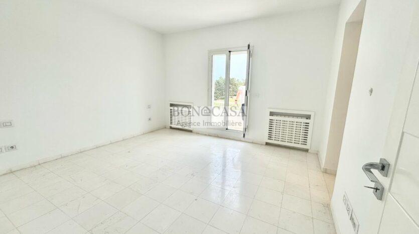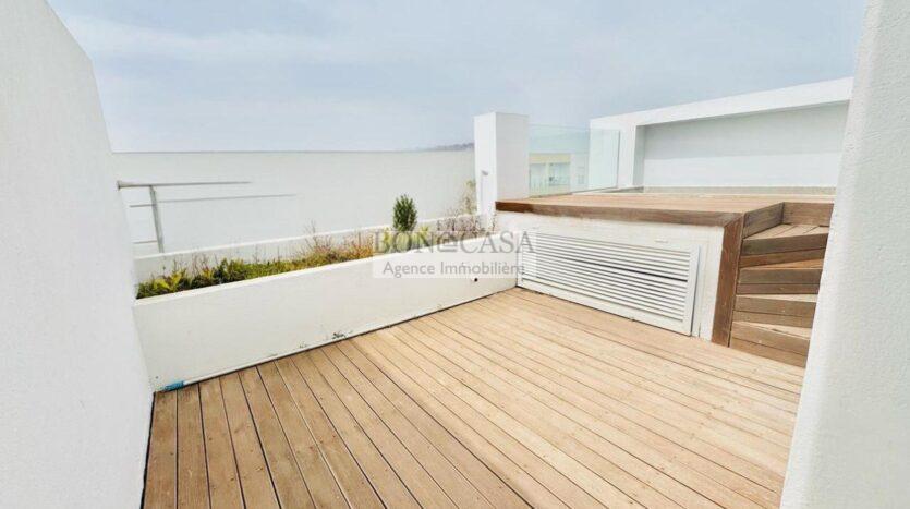 Le rez-de-chaussée se compose d’un grand salon/salle à manger lumineux ouvrant sur une grande terrasse, une cuisine bien équipée avec un débarrât et une salle d’eau invités.