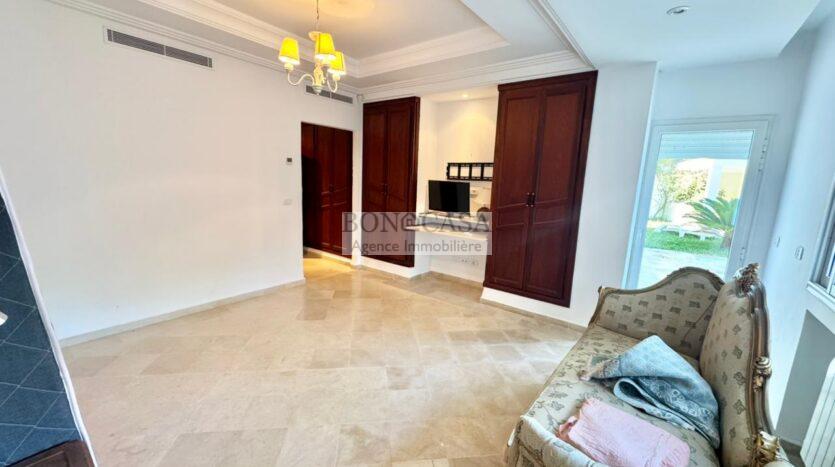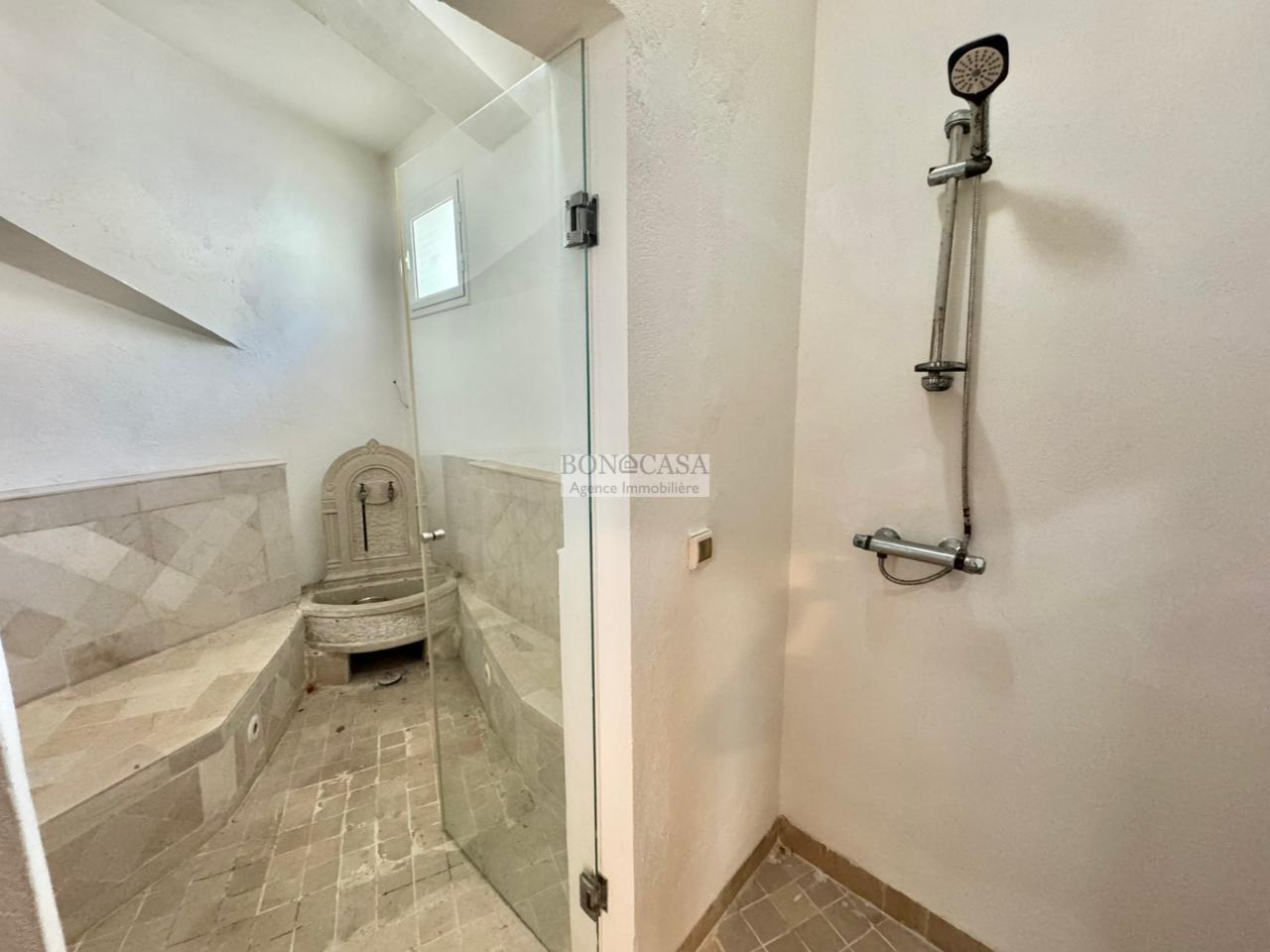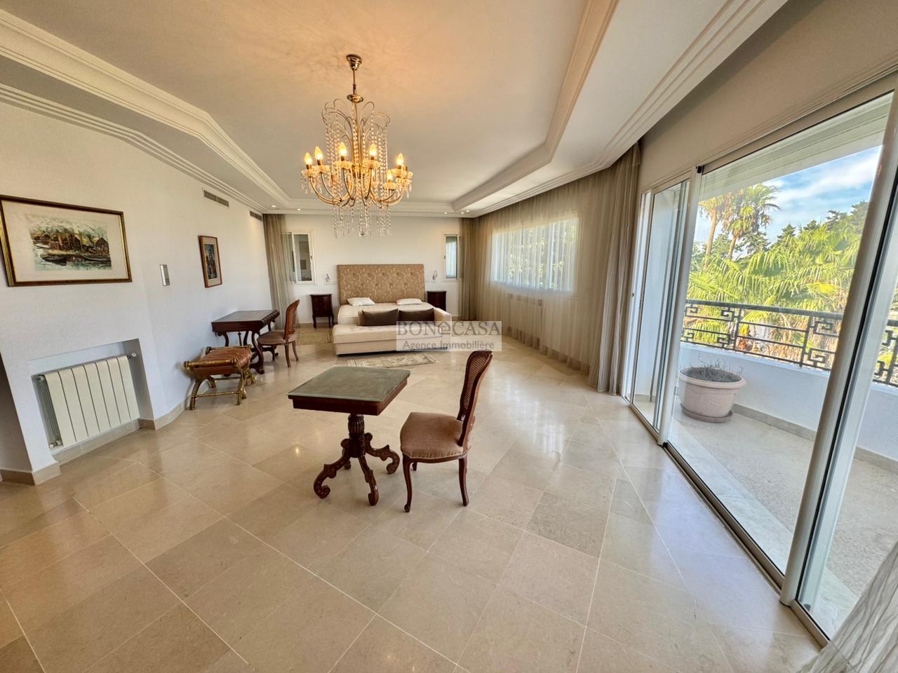 Le rez-de-jardin abrite un deuxième salon/salle à manger spacieux donnant sur un joli jardin, une piscine et une terrasse, une deuxième suite, une deuxième cuisine équipée, une salle d’eau invités, un Hammem, une suite de service et une buanderie.
