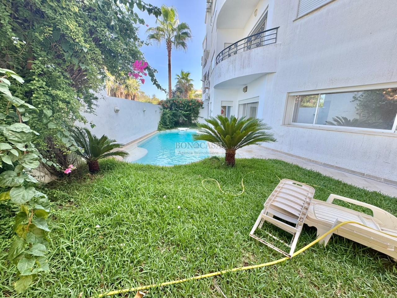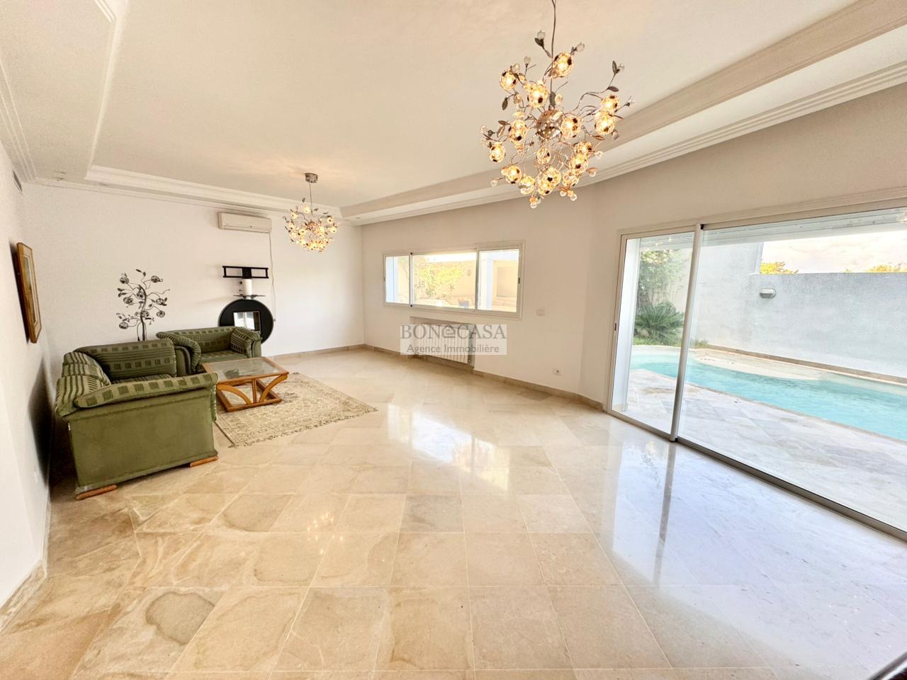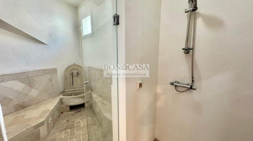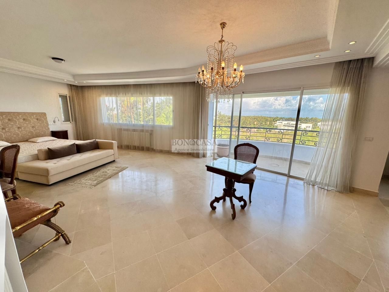 Le rez-de-jardin abrite un deuxième salon/salle à manger spacieux donnant sur un joli jardin, une piscine et une terrasse, une deuxième suite, une deuxième cuisine équipée, une salle d’eau invités, un Hammem, une suite de service et une buanderie.