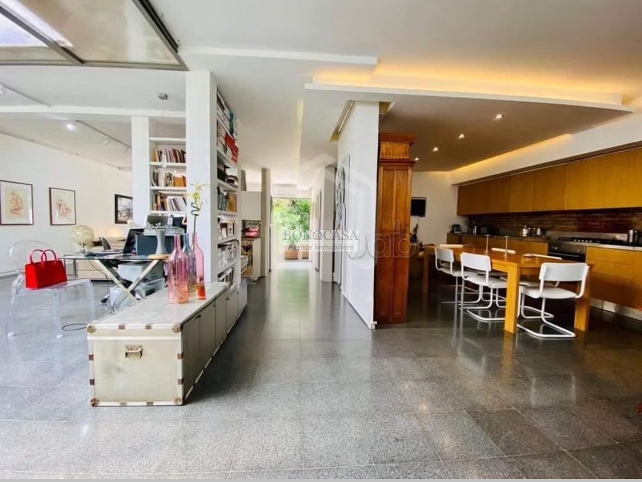 Le rez-de-chaussée se compose d’un vaste salon donnant sur un jardin et une piscine avec fontaine sans aucun vis-à-vis, un séjour, un coin cheminée, un bureau, une salle à manger, une cuisine entièrement équipée (four, plaque, hotte, lave vaisselle, frigo) et une salle d’eau invités.