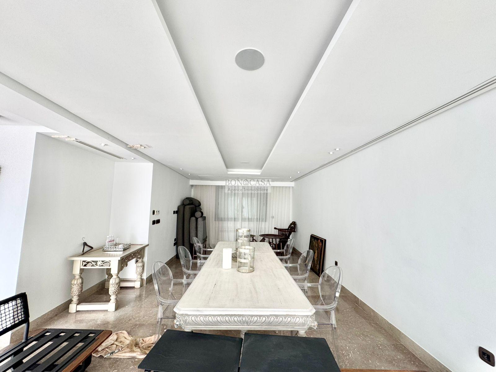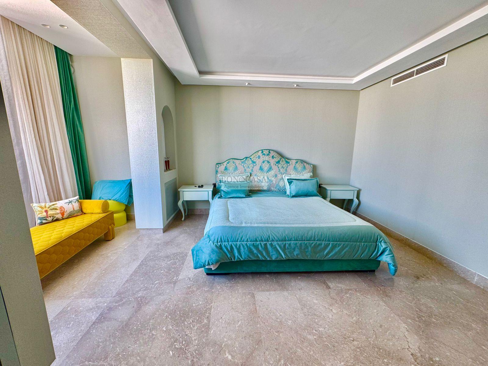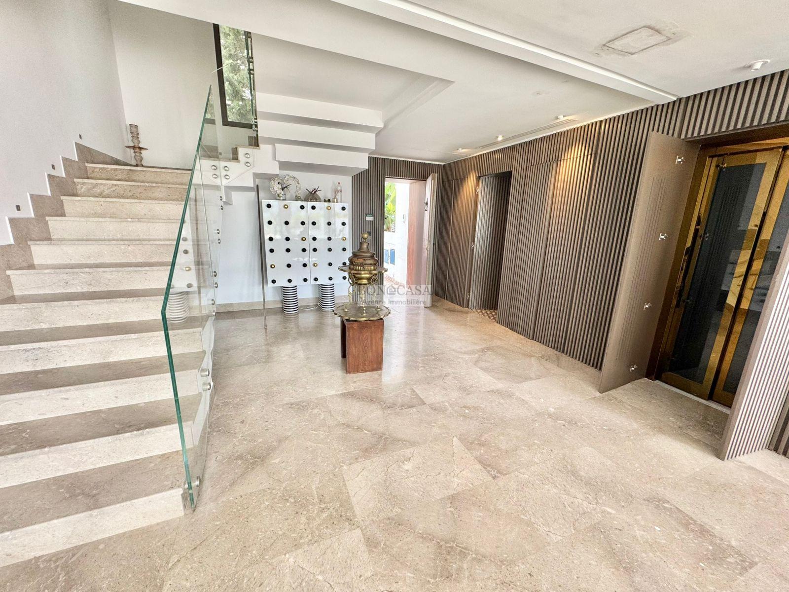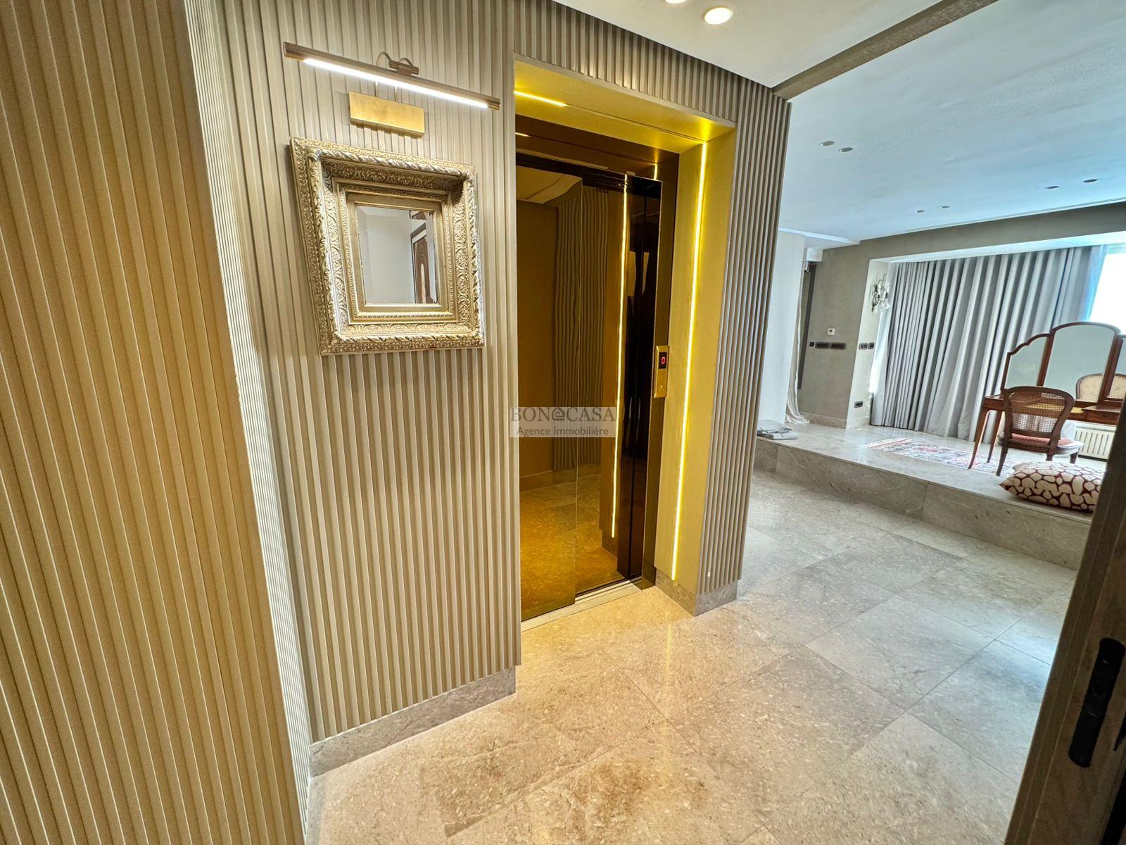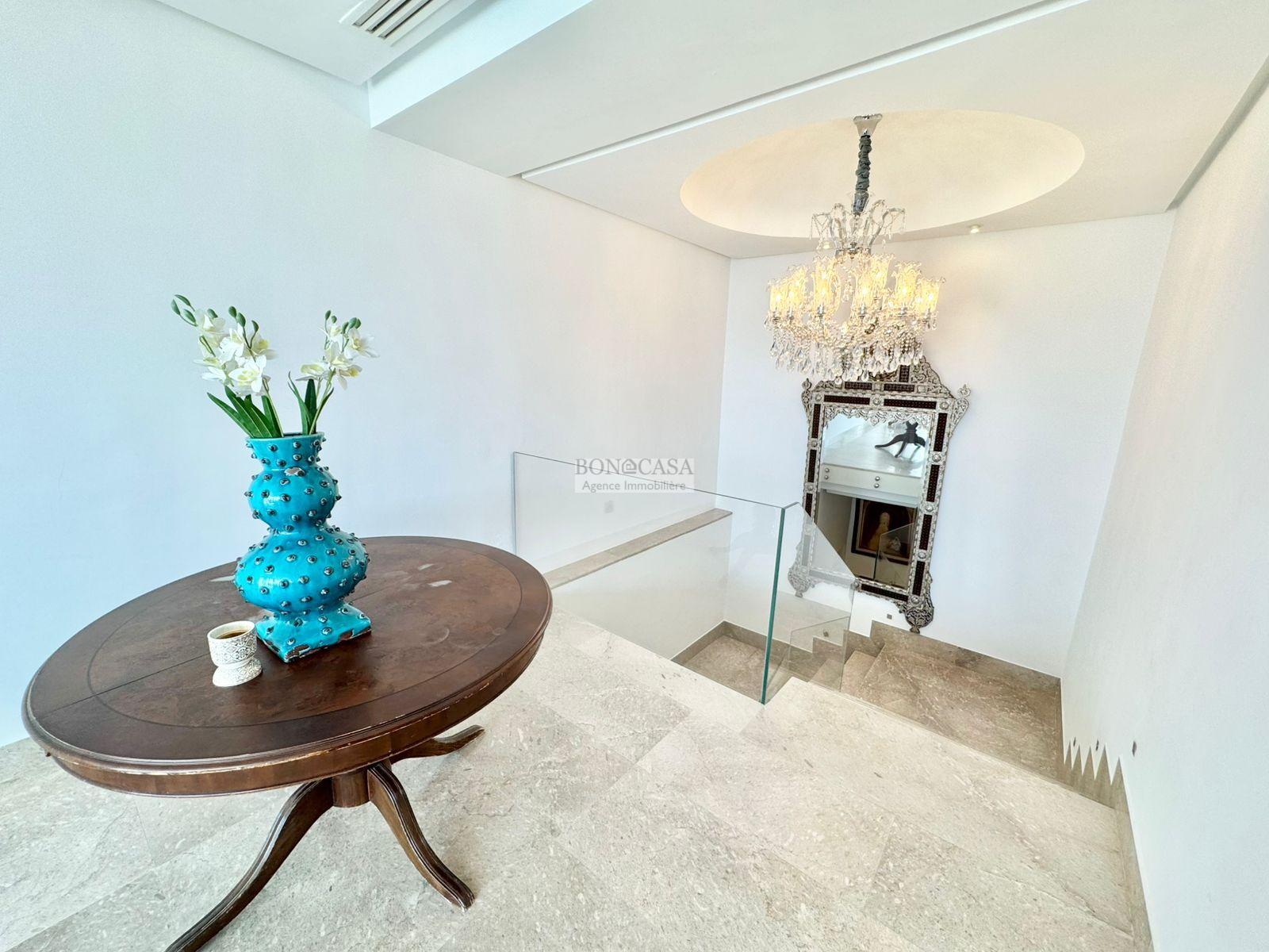 BONACASA vous propose à la location une luxueuse villa richement meublée avec un style moderne et raffiné sur quatre niveaux avec ascenseur située dans un quartier résidentiel bien gardée sur les collines de Gammarth.