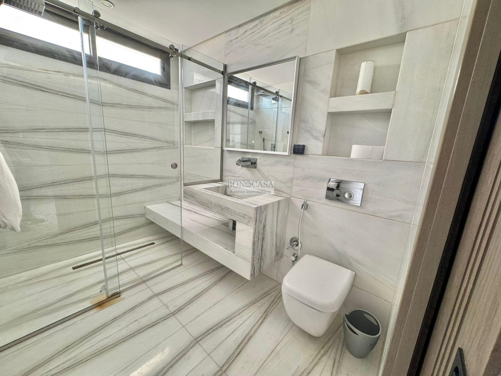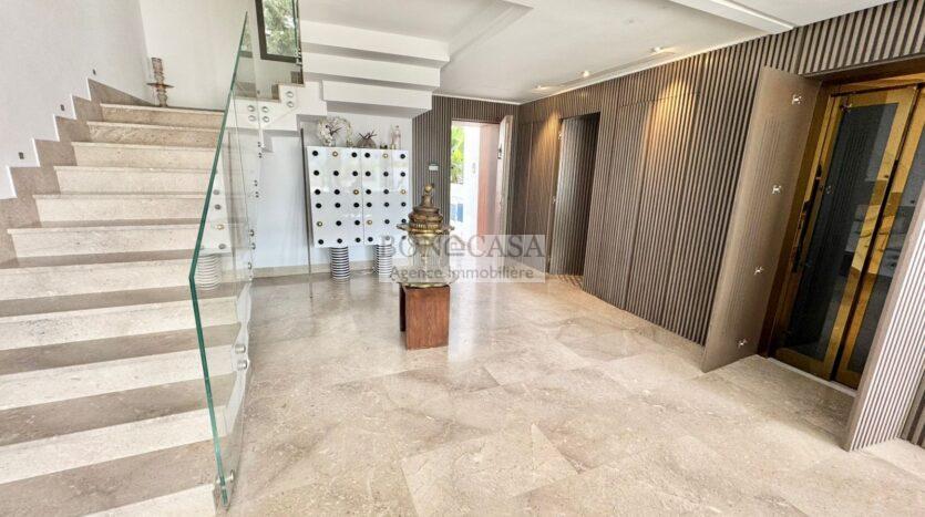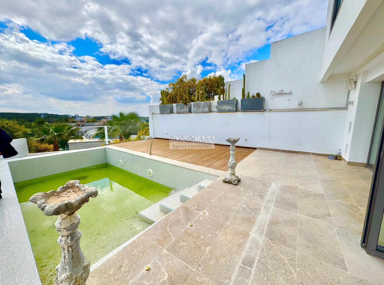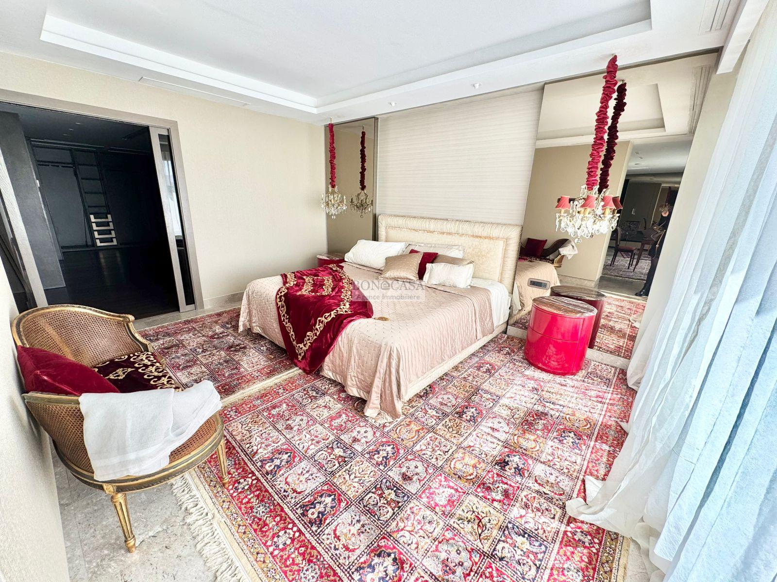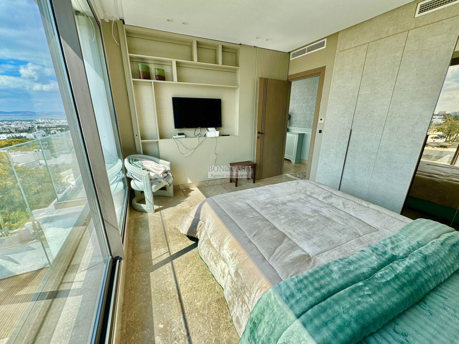 BONACASA vous propose à la location une luxueuse villa richement meublée avec un style moderne et raffiné sur quatre niveaux avec ascenseur située dans un quartier résidentiel bien gardée sur les collines de Gammarth.