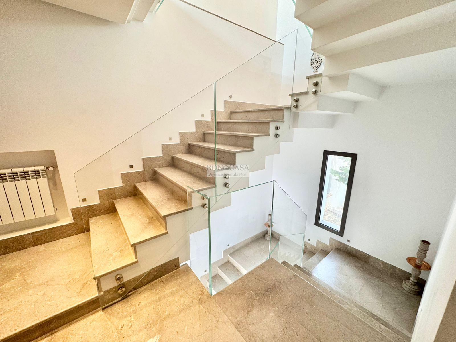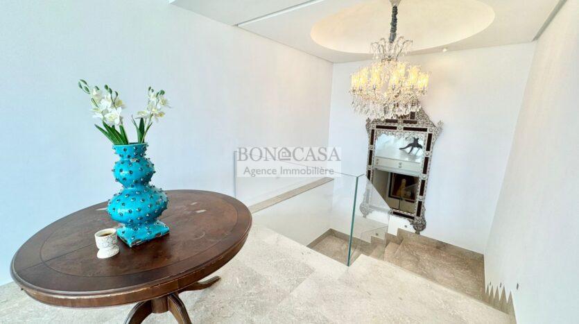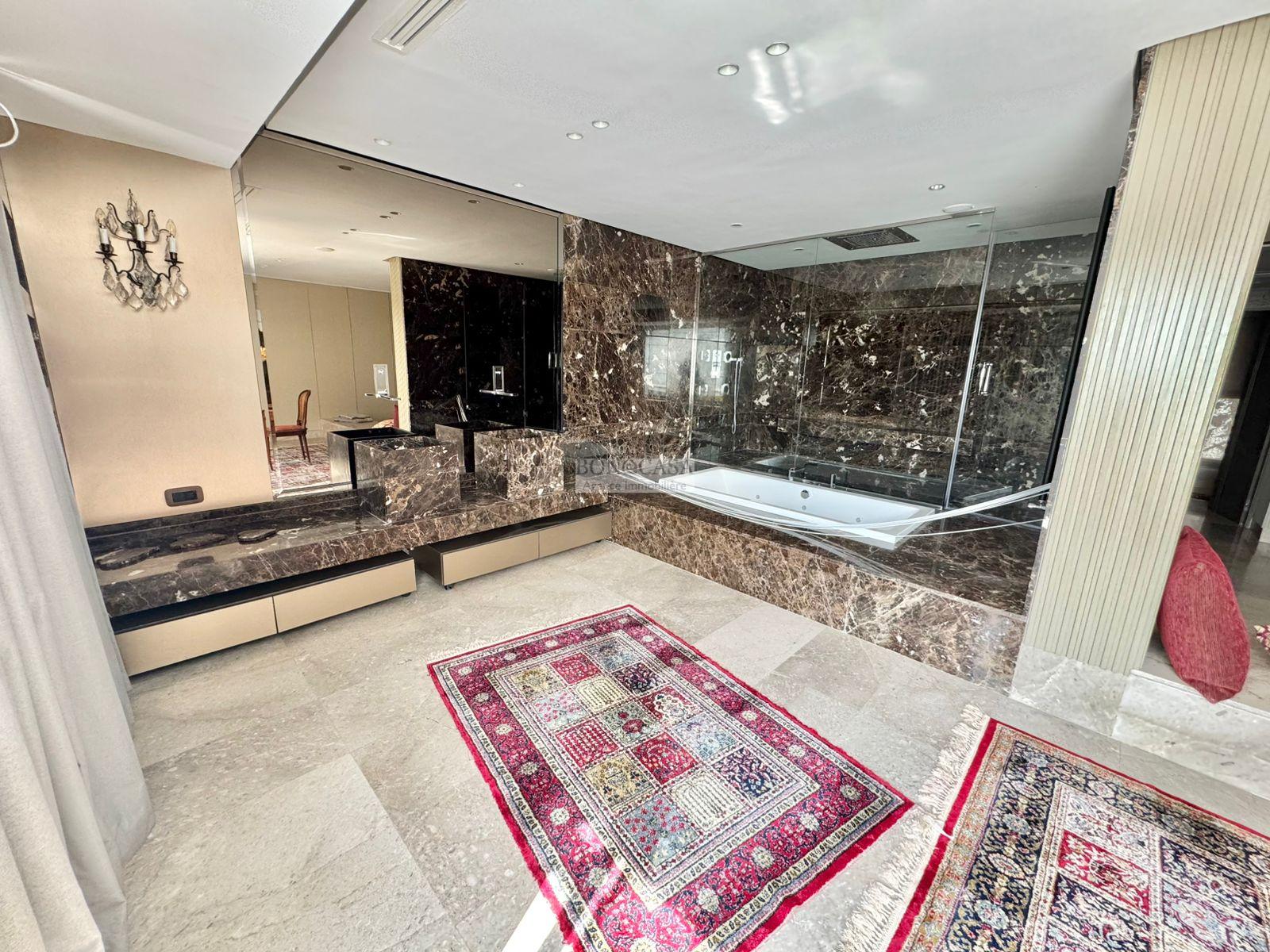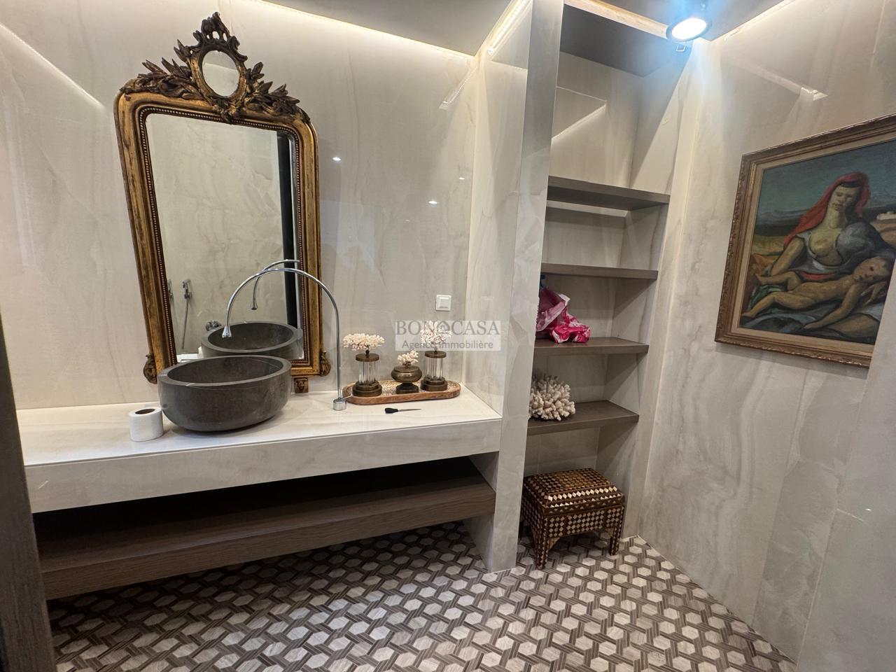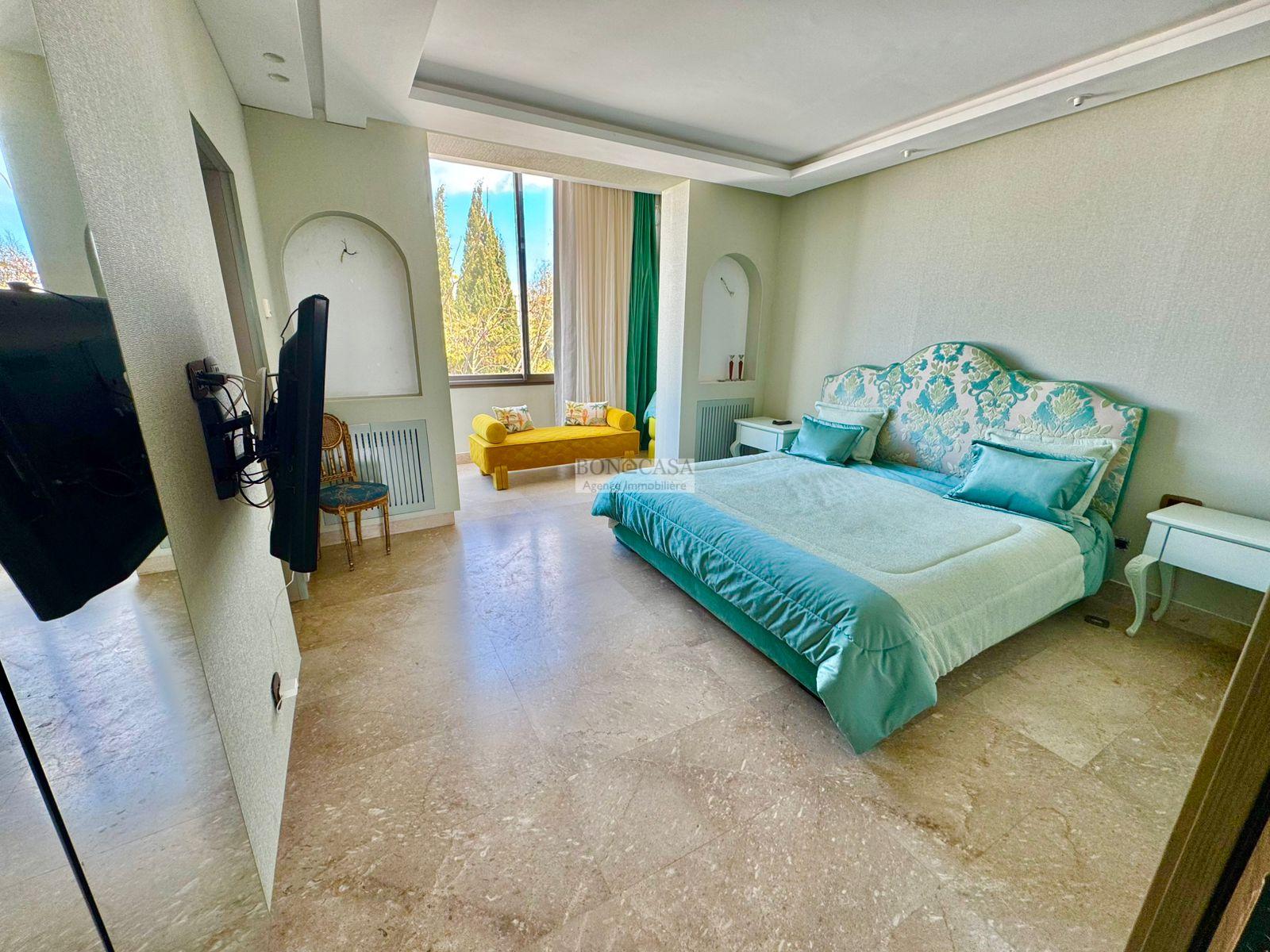 BONACASA vous propose à la location une luxueuse villa richement meublée avec un style moderne et raffiné sur quatre niveaux avec ascenseur située dans un quartier résidentiel bien gardée sur les collines de Gammarth.