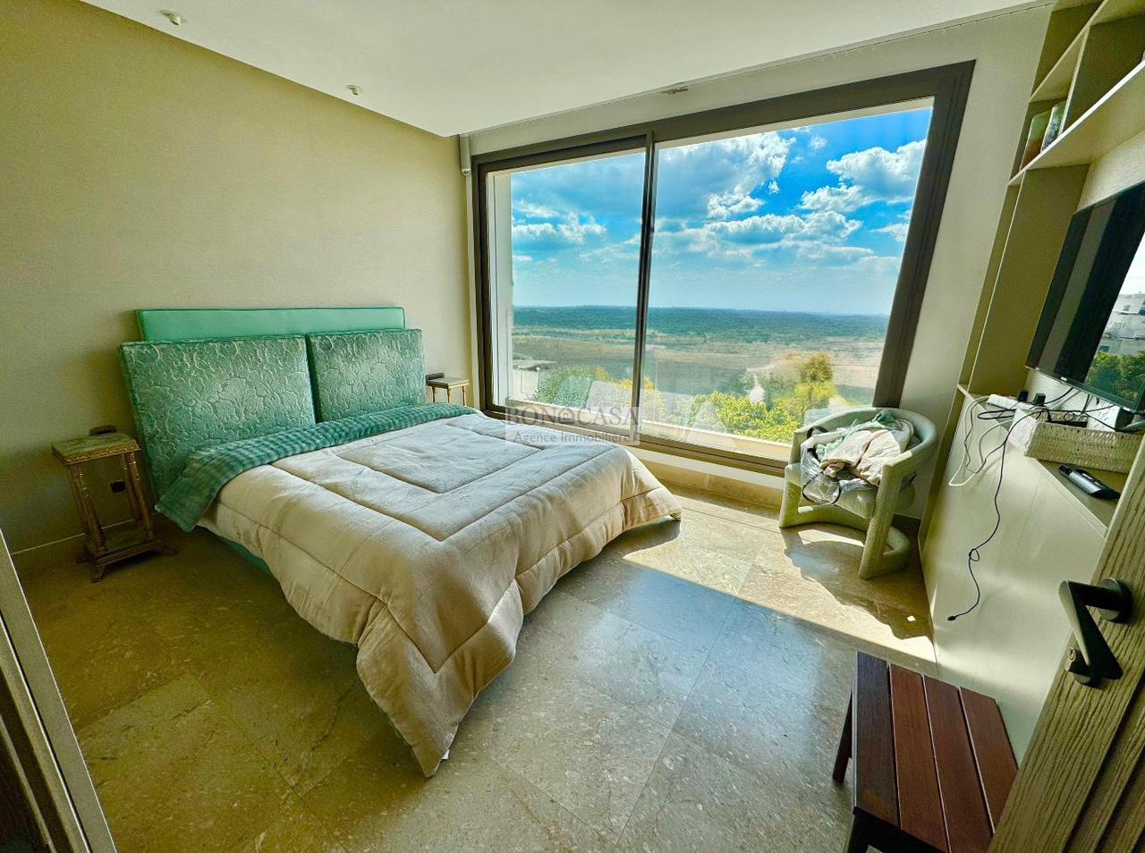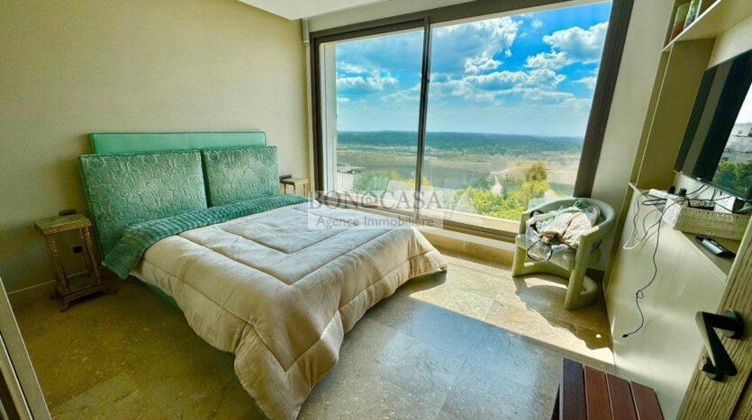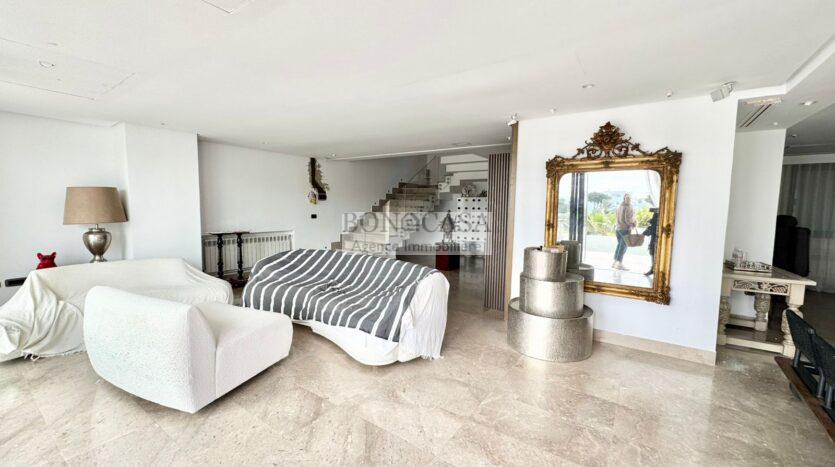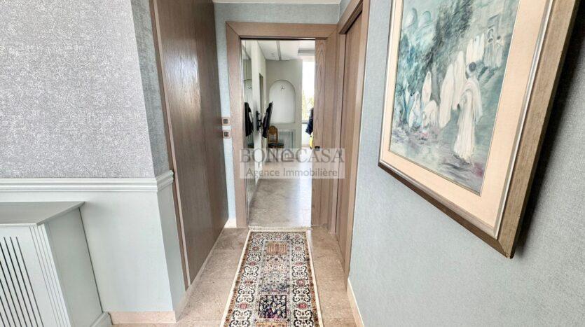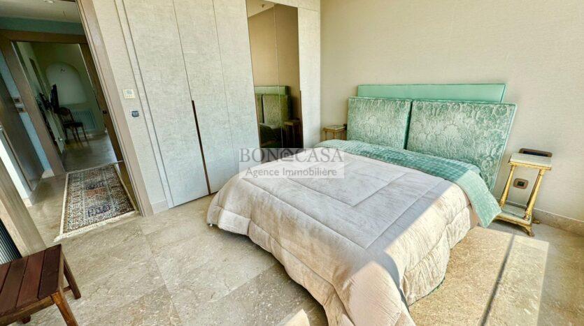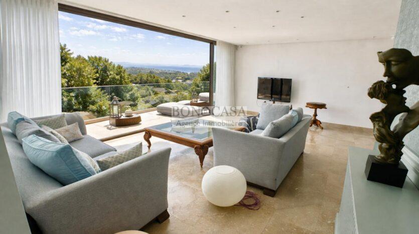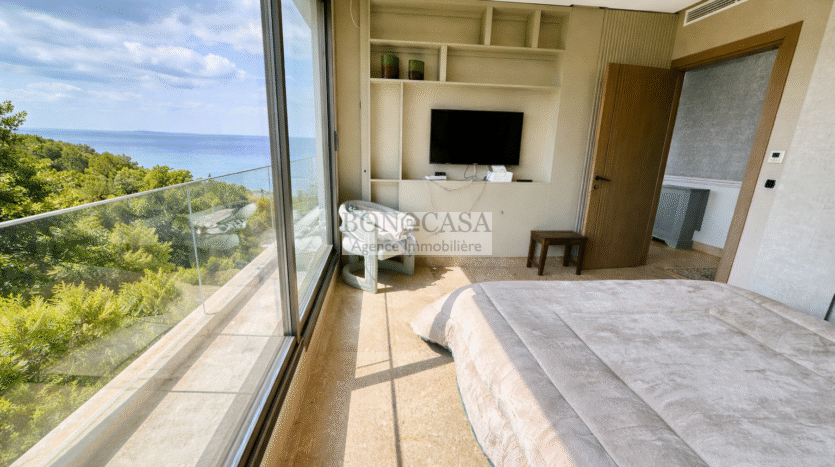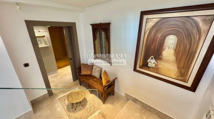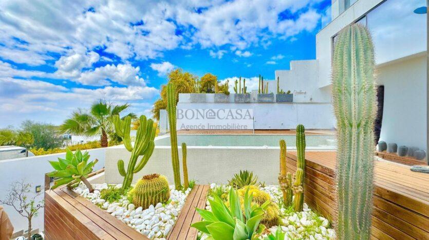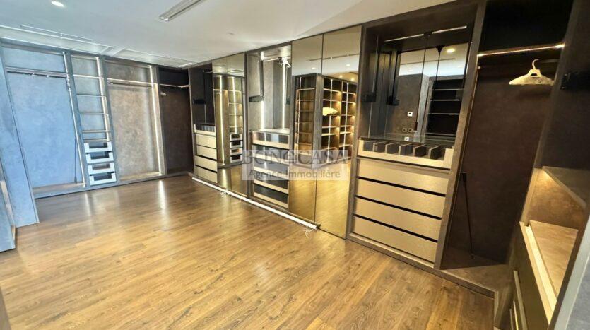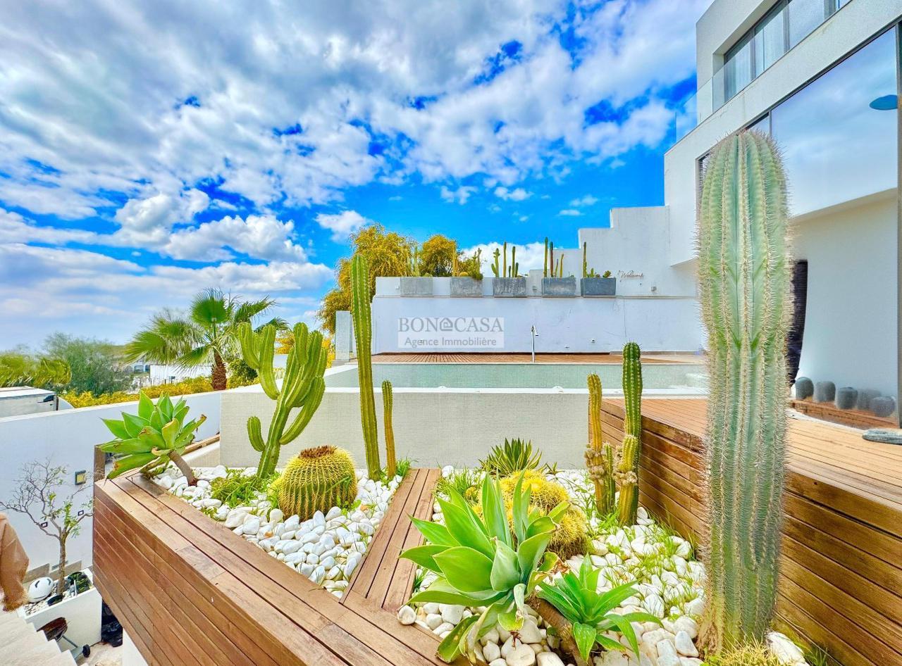 Le deuxième étage abrite un deuxième salon bien ensoleillé grâce à l’ouverture de sa baie vitrée qui donne sur une terrasse avec une vue dégagée, une cuisine entièrement équipée, deux chambres à coucher avec dressing partageant une salle d’eau commune avec douche à l’italienne.
