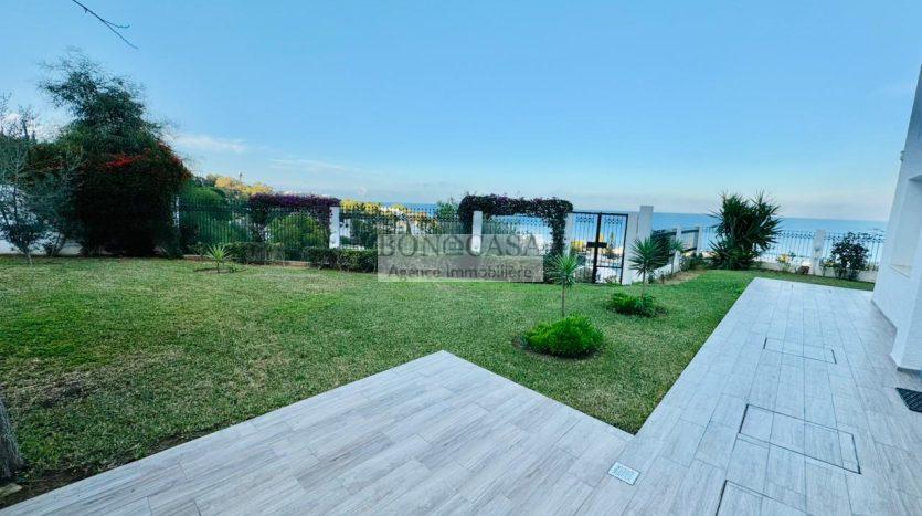 Le rez-de-chaussée se compose d’un salon spacieux et lumineux donnant sur un grand jardin gazonné avec une magnifique vue sur mer,